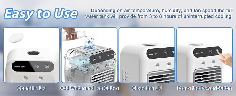 Keep Your Cool and Comfortable - Our portable mini air conditioner operates at a low noise level of less than 45dB and can last up to 8 hours without frequent refills of water or ice water.