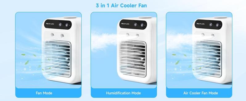 - seconds to get a regular mini air cooler. There are two wind speeds and one spray for synchronized cooling and hydration, allowing different wind speeds to meet different cooling needs in the summer.